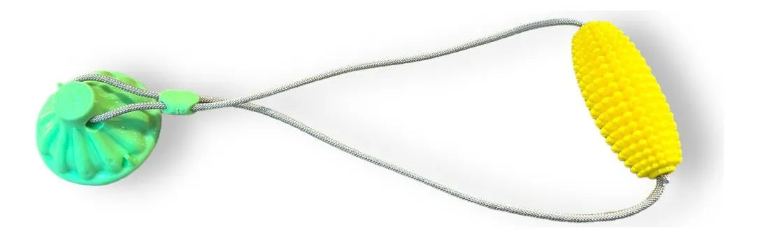 Juguete dental interactivo diseñado para mantener la higiene bucal de tu perro mientras se divierte. Su forma de choclo estimula la masticación natural, promoviendo la limpieza de dientes y encías. Equipado con ventosa de succión fuerte, se adhiere firmemente a superficies lisas, permitiendo que tu mascota juegue de forma independiente. Ideal para perros de diferentes tamaños. Duradero y fácil de limpiar, combina entretenimiento con cuidado dental preventivo.